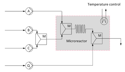 In a continuous flow system, a chemical reaction is carried out with a continuous supply of substrate and reagents. The basic principle of a continuous flow system is shown schematically in the figure below. In this commonly used setup, two flows (denoted as Flow A and Flow B) are pumped into a micro reactor. Future Chemistry’s micro reactors are small continuous flow reactors made from glass, combining excellent mixing and channels for reaction with excellent temperature control. After being mixed, the solutions will start reacting. When the combined flow reaches the end of the micro reactor, a third flow is introduced to stop the reaction. This is called the quenching flow, and is denoted as Flow Q